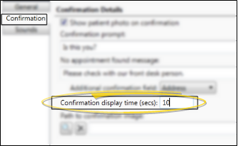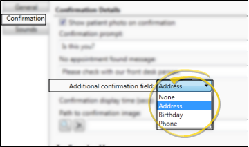 Additional confirmation display field- You can display an additional field of information in the list of matching names that appears after the patient types his or her name into the Patient Sign-In prompt. Select Address, Birthday, Phone number, or None. This setting helps avoid the confusion that could result from multiple patients with identical or similar names.