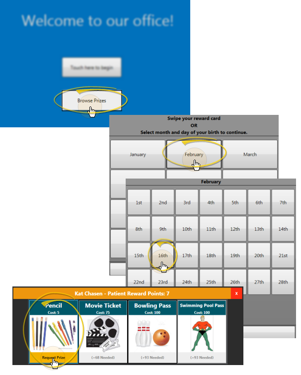 (Optional.) If you have included a Prize Selector button on your sign-in greeting screen, patients can press the button, then either swipe their card (if enabled) or enter their birthday month and day to review their reward point total, browse prizes, and select a prize, which triggers the pending prize process. (See "Use the Patient Rewards Prize Selector" for details.)