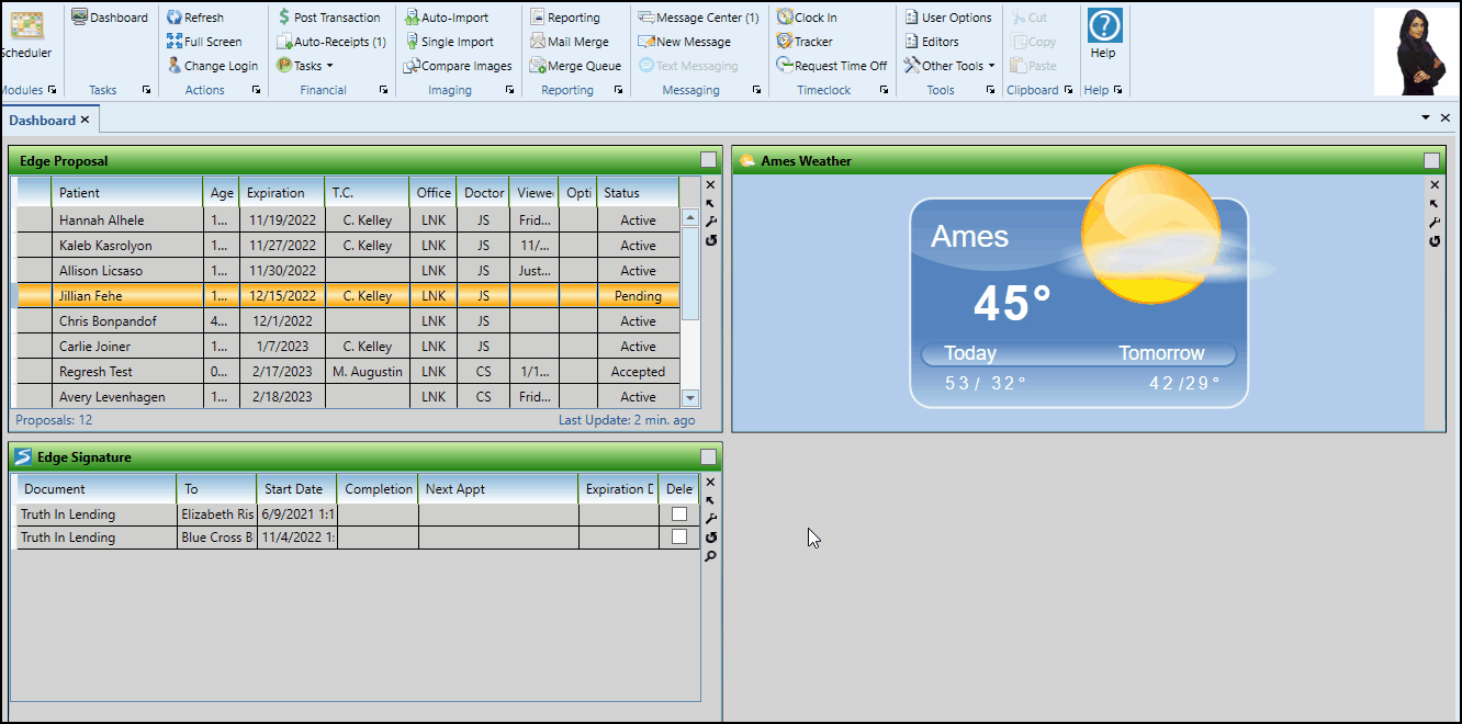 Right-click the proposal in the Edge Proposal widget and choose Edit to open the patient's Finance page, with the Edge Proposal tab selected. Or simply double-click the proposal in the widget.