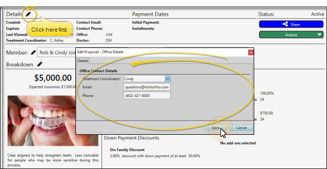 Click the icon beside the Details heading at the top of the proposal to select a treatment coordinator and contact details for the proposal. The default contact details are from the Treatment Coordinator editor, or from your Office editor if no TC contact info is available. If you change the details in that editor, they will change in proposals assigned to that TC. However, if you manually change contact details in a patient proposal, that does NOT change the details in the TC editor.