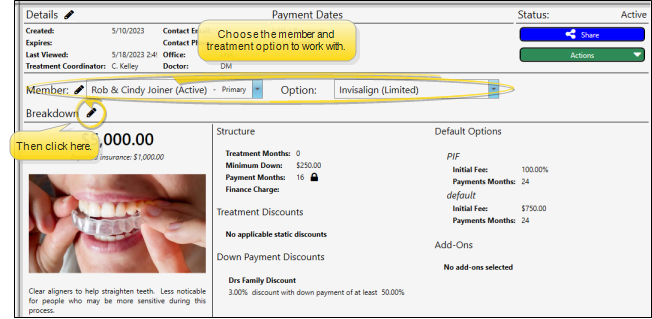If the patient has multiple responsible parties, or you are offering multiple proposal templates, choose which proposal you want to work with. Then click the icon beside the Breakdown heading to edit the financial details for that proposal. The details are split into three tabs of information.
