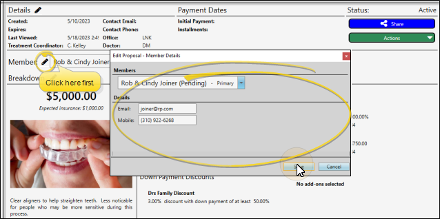 Click the icon beside the Members field. You can then update the email address and phone number of each responsible party assigned to the proposal. This is the email that will be used if you share proposal notifications via email. This does NOT change the contact details in the patient folder.