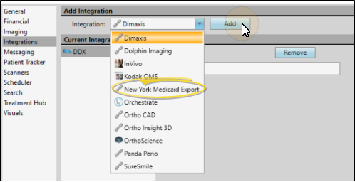 Open the User Options window from the File, Home, Patient, or Scheduler ribbon bar. Then choose the Integrations tab. Select New York Medicaid Export from the drop down list at the top of the window and click Add.