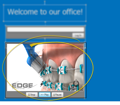 Video - You can add educational or entertaining video clips, such as Edge Animations videos, to your patient sign-in screen.To add a new video, click Add from the Sign-In Editor ribbon bar, and select Video. Then navigate to your video file, and click to position the object on your screen. You can then right-click within the element to modify additional properties, such as hiding the video controls from your patients. (See "Publish and Share Edge Animations Videos" for details about publishing Edge Animations videos.) Most standard video file formats will work with Patient Sign-In.